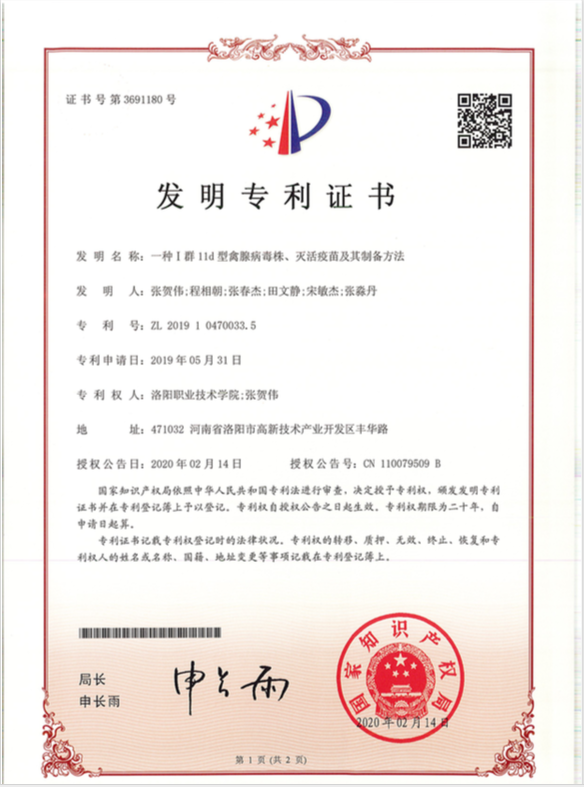 近日,我院食品与药品学院张贺伟博士接到中华人民共和国国家知识产权局授权的“一种I群11d禽腺病毒株、灭活疫苗及其制备方法”发明专利证书(专利号:ZL 201910470033.5),这是我院教师首次以第一单位荣获国家知识产权局授权的发明专利,实现我院在发明专利授权上的零突破。