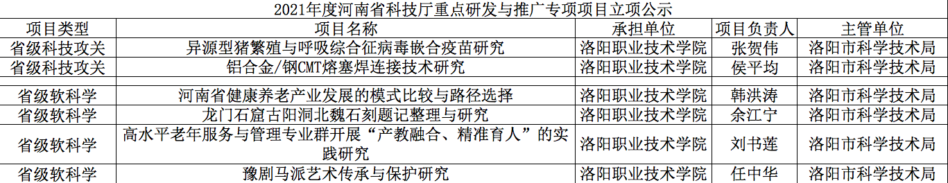 近日,从省科技厅公布的《关于2021年度河南省重点研发与推广专项(科技攻关、软科学研究)拟支持项目的公示》获悉,我院申报的省级科技攻关项目获批2项立项,省级软科学项目获批4项立项,取得了省级项目立项的重大突破,总体立项数量在全省高职高专院校中名列前茅。
