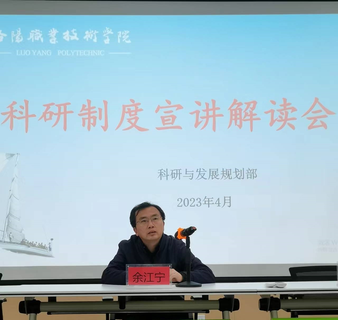 为了使广大教师熟悉学校科研管理政策,进一步提高科技创新的积极性,推进科研制度改革,科研与发展规划部于2023年4月28日下午午组织召开了科研管理制度宣讲解读会。副校长余江宁出席会议并发表讲话,科研与发展规划部全体人员、各二级教学院部分管科研工作的副院长、科研秘书、部分教师代表,以及洛阳市科技创新促进和情报研究中心刘燕聪主任、伊滨区科技局刘少峰副局长参加会议。