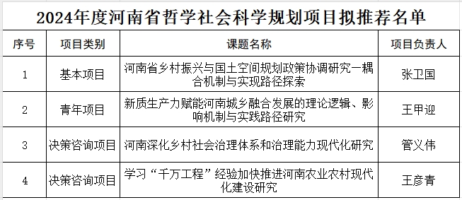 根据河南省哲学社会科学工作事务中心《2024年度河南省哲学社会科学规划项目申报公告》要求,经个人申报,学院审核,专家评审,现将2024年度河南省哲学社会科学规划项目拟推荐名单予以公示(排名不分先后),公示期:2024年8月6日至8月8日。