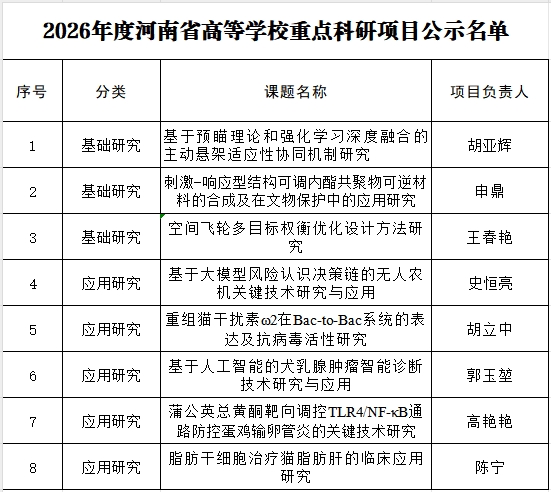 根据《河南省教育厅办公室关于申报2026年度河南省高等学校重点科研项目计划的通知》(教办科技〔2025〕120号)要求,经个人申报,学院审核,专家评审,现将拟推荐项目予以公示(名单见附件),公示期2025年5月23日至5月27日。