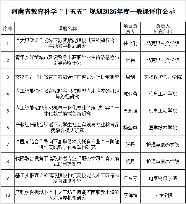 经专家评审,现将河南省教育科学“十五五”规划2026年度一般课题评审拟推荐名单予以公示(排名不分先后),公示期:2026年4月8日至4月10日。